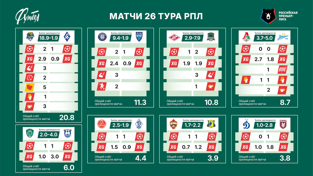 До этого лучшие результаты принадлежали «Зениту» (17.5 БЗ за 5:2 с «Оренбургом»), «Спартаку» (17.4 БЗ за 5:2 с «Локомотивом») и «Краснодару» (17.1 БЗ за 5:0 с «Пари НН»). Каждому из грандов для преодоления 17-балльного рубежа требовалось поразить ворота соперников по пять раз. Тем удивительнее, что новые рекордсмены РЗ ограничились всего двумя голами…