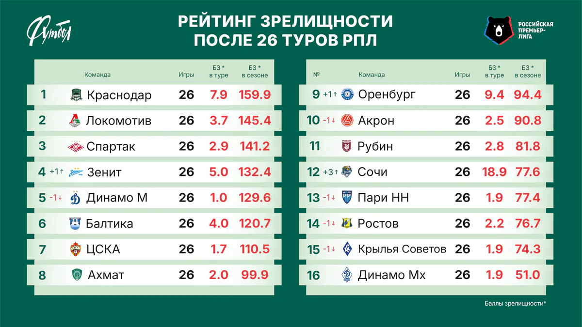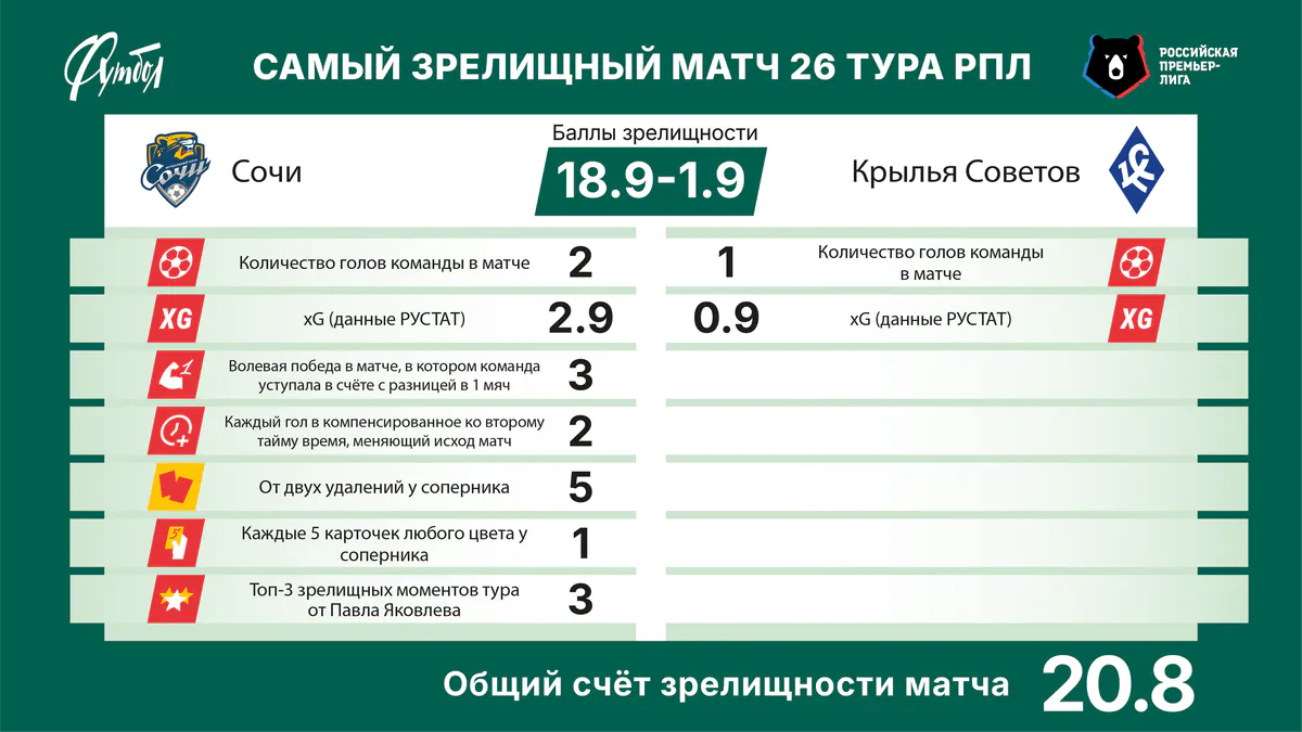 Любопытен и другой факт: феноменальный показатель хозяев не сделал матч на «Фиште» первым в списке самых зрелищных в сезоне-2025/2026. Вклад «Крыльев» (1.9 БЗ) оказался слишком маленьким. И с суммой 20.8 игра уступила встречам «Динамо» – «Локомотив» (22.4 БЗ в 11-м туре) и «Оренбург» – «Ахмат» (23.1 в 6-м).