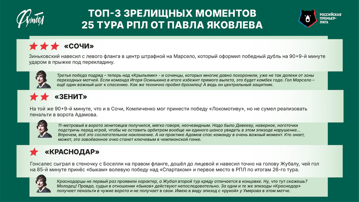 Тем временем Яковлев включил в свой Топ-3 другие решающие эпизоды концовок. «Зенит» получил от бывшего спартаковца два бонусных балла за отражённый Денисом Адамовым на 90+9-й минуте пенальти в матче с «Локомотивом» (0:0). А «Краснодар» заработал один дополнительный БЗ за победный мяч Жубала на 85-й в московской игре с красно-белыми (2:1). В итоге «быки» увезли из Тушина 7.9 БЗ. Это позволило им упрочить лидерство в РЗ. Отрыв от того же «Спартака» увеличился почти до 19 баллов, а от «Локо» — до 15.