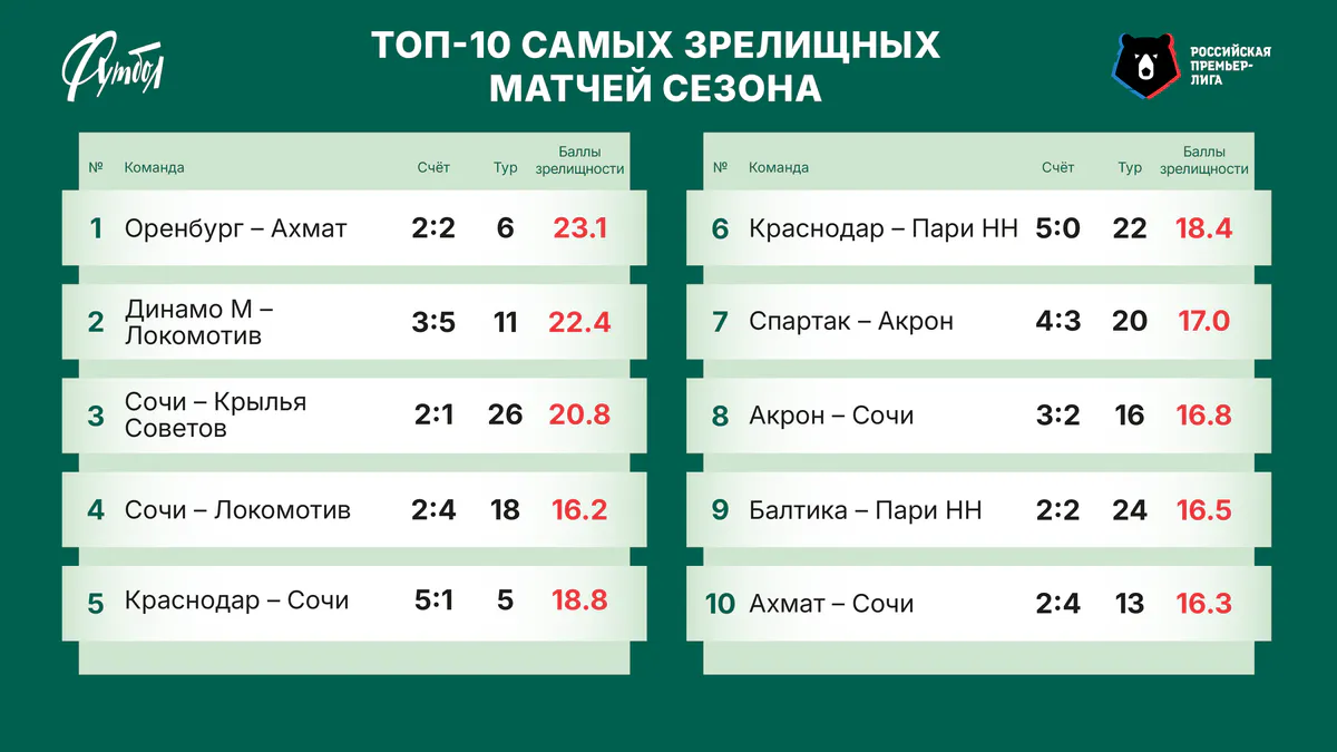 Тон всему туру задали сочинцы, которые ещё в пятницу совершили эффектный камбек в матче с «Крыльями Советов» (2:1). Эта победа не только возродила надежды команды Игоря Осинькина на сохранение места в РПЛ, но и позволила ей подняться сразу на три строчки в нашем Рейтинге зрелищности (РЗ), заработав невероятное число баллов зрелищности (БЗ).