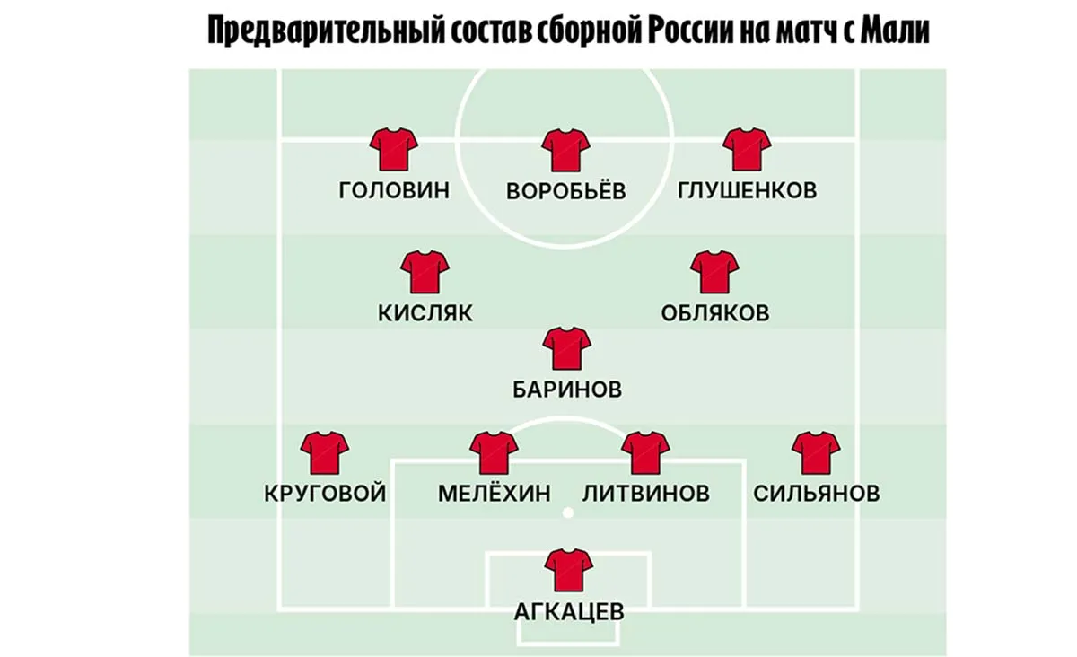 Есть вопросы к обороне — из-за травм Игоря Дивеева и Максима Осипенко у Карпина не осталось альтернатив, но по первому матчу к дуэту Литвинов — Морозов было минимум вопросов. А вот фланги наверняка стоит обновить. Пальцев хорош в обороне, но мало помогает при развитии атак, поэтому тренерский штаб наверняка даст много игрового времени Александру Сильянову. Но основная надежда, конечно же, на линию атаки. Глушенков и Головин умеют играть даже при отсутствии открытого пространства — а именно такую модель игры наверняка предложат малийцы. К тому же оба находятся в блестящей форме — Александр незаменим в «Монако», а Максим уверенно выигрывает конкуренцию у Луиса Энрике — игрока сборной Бразилии!