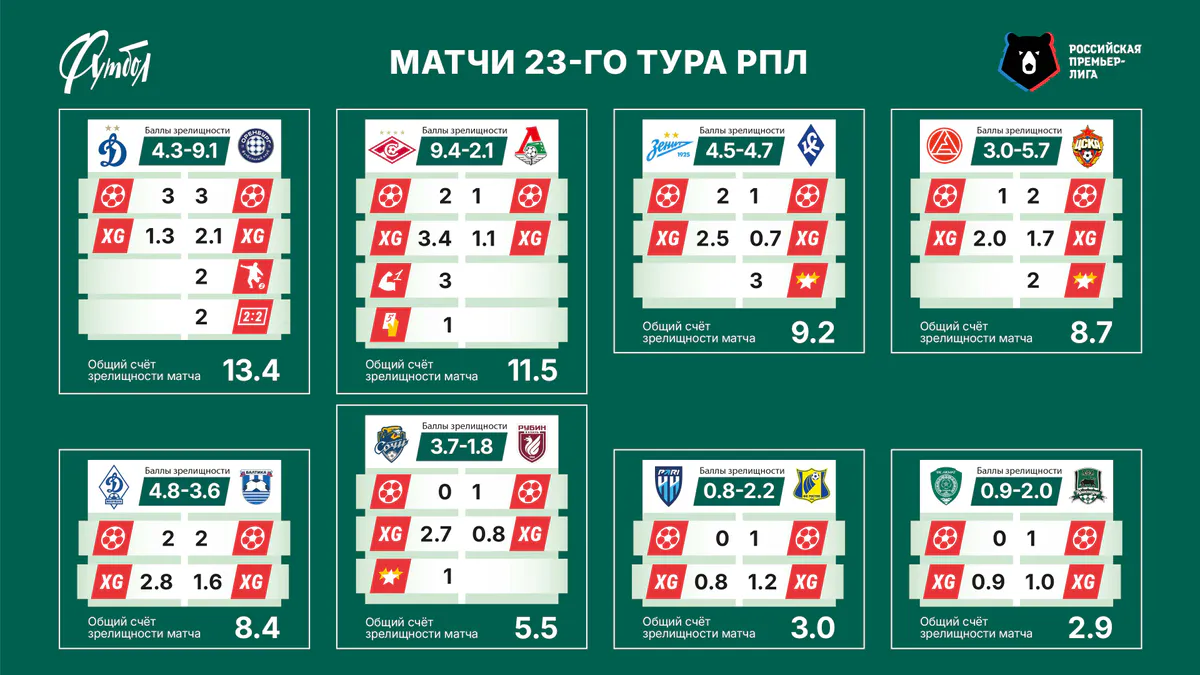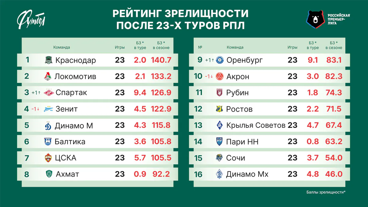 «Спартак» обогнал «Зенит», питерцы выпали из тройки. Рейтинг зрелищности после 23-го тура