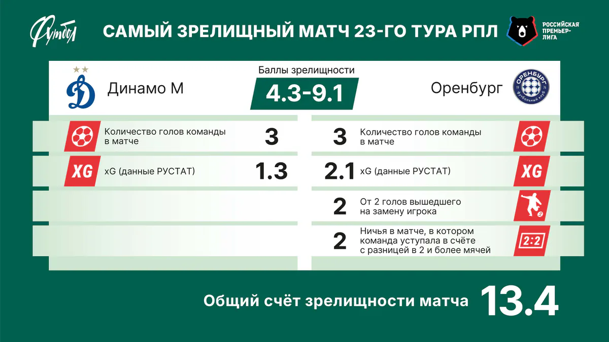 Впрочем, до звания самого зрелищного в туре матч на «Самара Арене» всё равно недотянул бы. А игра «Динамо» – «Оренбург» не попала в топ-10 сезона-2025/2026. Хочется вериться, перемены в этой «десятке» ещё впереди.