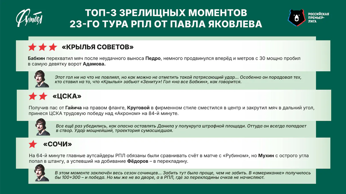 Разумеется, были отмечены Яковлевым и два сумасшедших дальних «выстрела» – в исполнении самарца Сергея Бабкина и «армейца» Данила Кругового. Эти голы наверняка попадут в число лучших по итогам сезона.