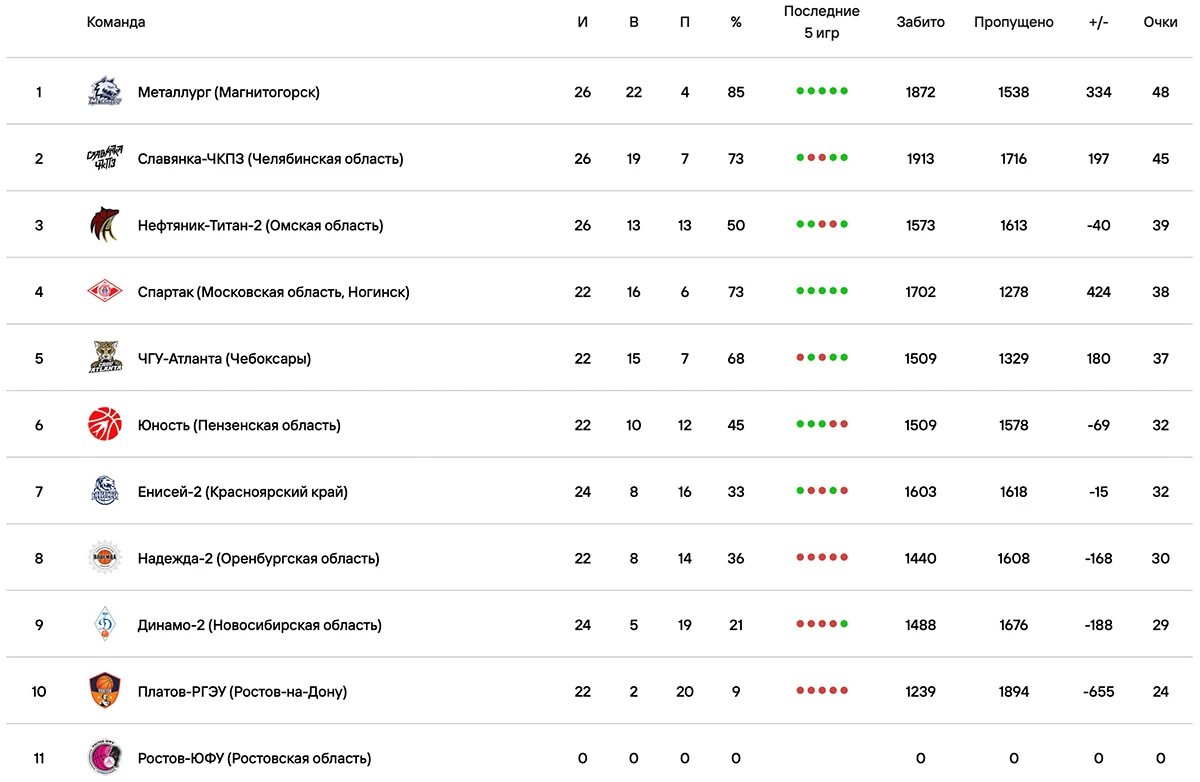 Лидером таблицы является магнитогорский «Металлург» (48 очков). За прошедшую неделю клуб победил в четырёх матчах: с «Надеждой-2» (20 и 21 января) и «Юностью» (24 и 25 января).