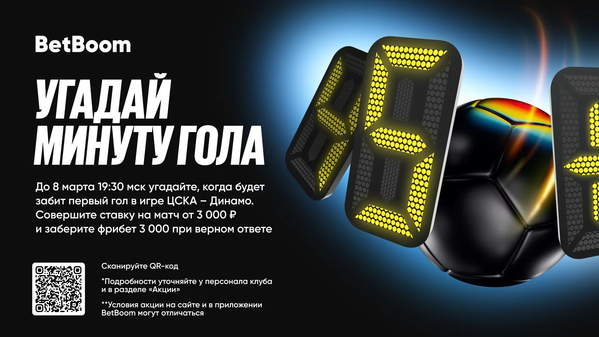 BetBoom уточняет, что фрибет в размере 3000 рублей получает каждый участник, точно угадавший минуту первого гола. Акция действует как в онлайн-формате, так и в наземных клубах сети букмекера, а полученные бонусы начисляются в соответствии со стандартными правилами компании.