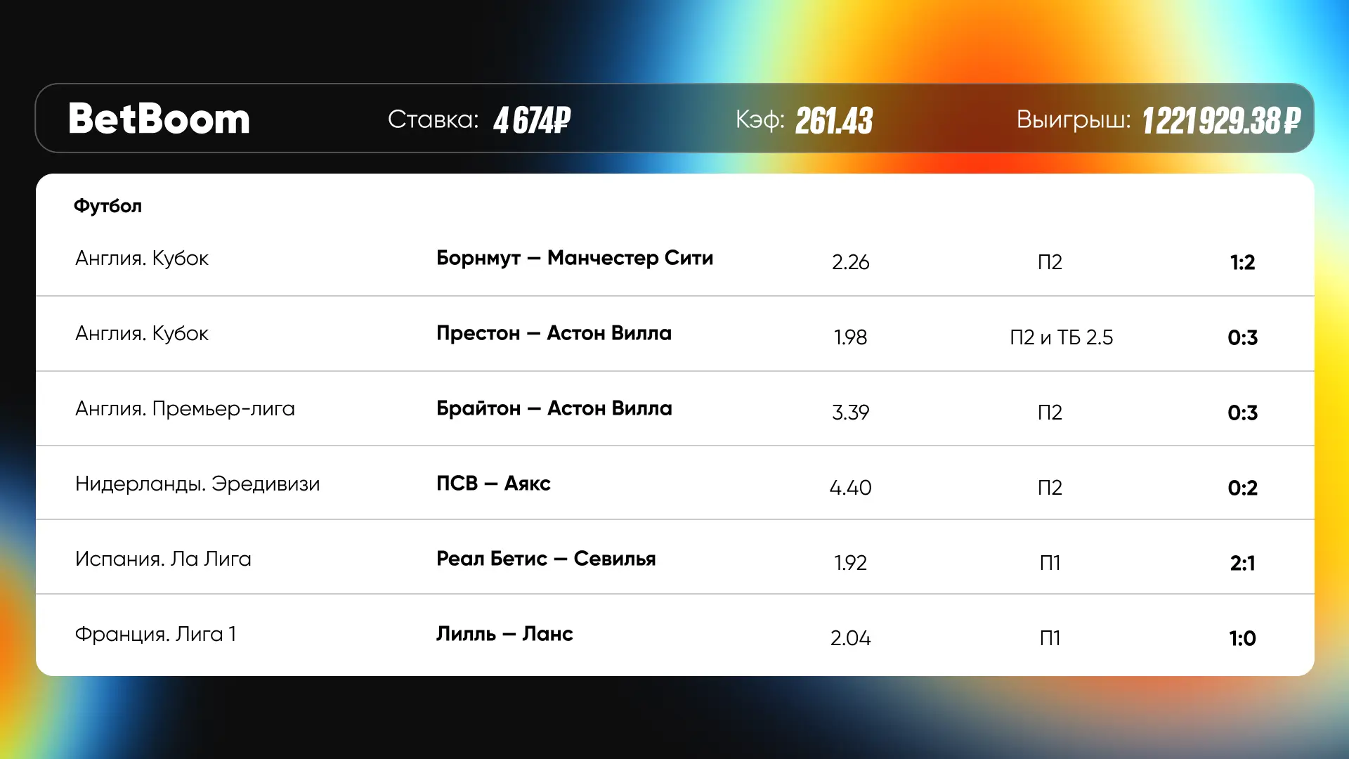 Прошедшая неделя удачно закончилась для клиента BetBoom. Он собрал экспресс на футбол, состоящий из исходов на топ-лиги Европы. Помимо пяти сильнейших чемпионатов, в купон также вошёл матч «Аякса» и ПСВ. Итоговый коэффициент «паровоза» – 261.43 – принёс беттору 1 221 929 рублей выигрыша со ставки всего в 4674.