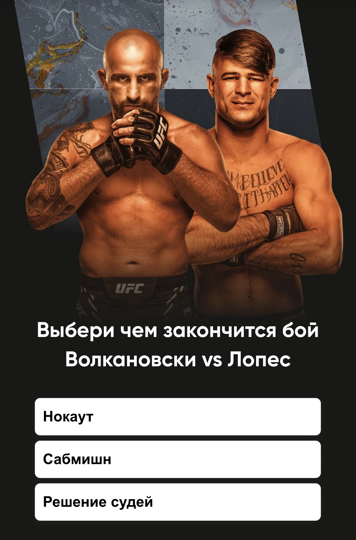 Фрибет БК BetBoom номиналом 5 000 рублей можно получить за ответ на вопрос о бое между Волкановски и Лопес и ставку на любое событие UFC 314. Бонус получат 100 случайных участников акции.