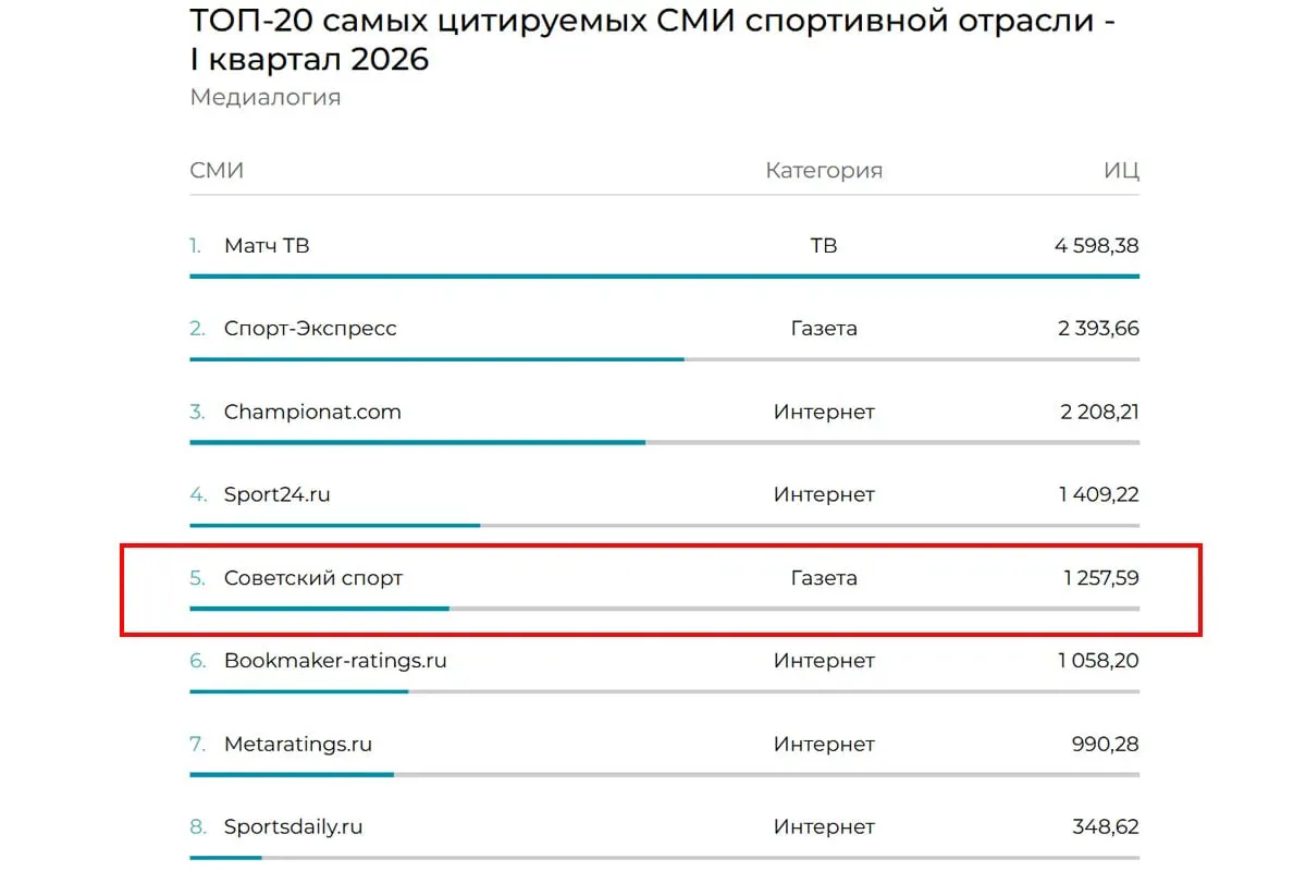 Компания «Медиалогия» представила рейтинг самых цитируемых медиаресурсов спортивной отрасли за первый квартал 2026 года. «Советский спорт» впервые вошёл в топ-5 списка.