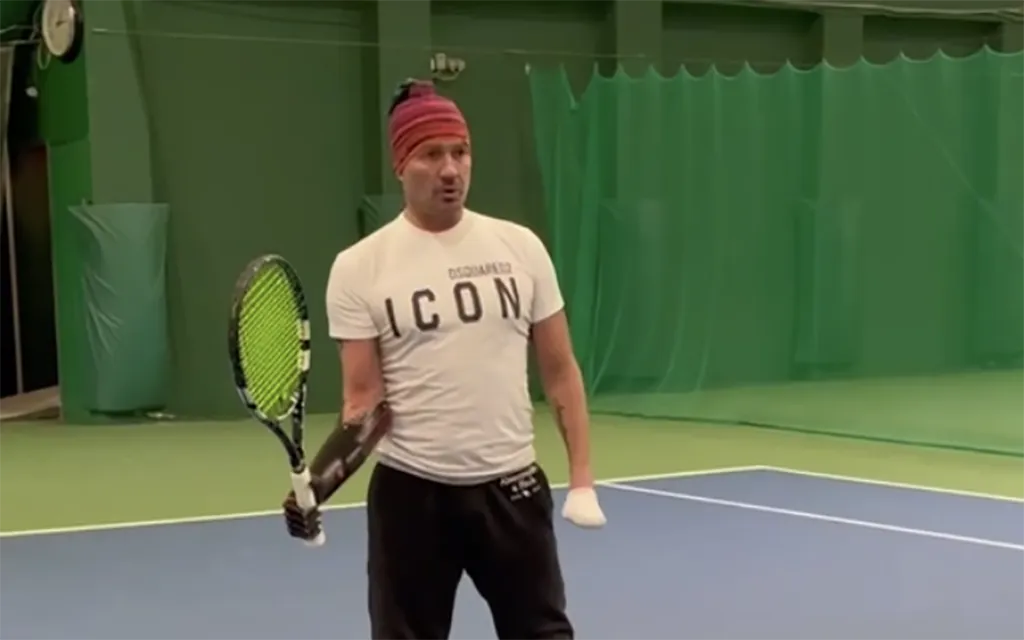 Фигурист Костомаров показал, как обучается играть в теннис с помощью протеза руки