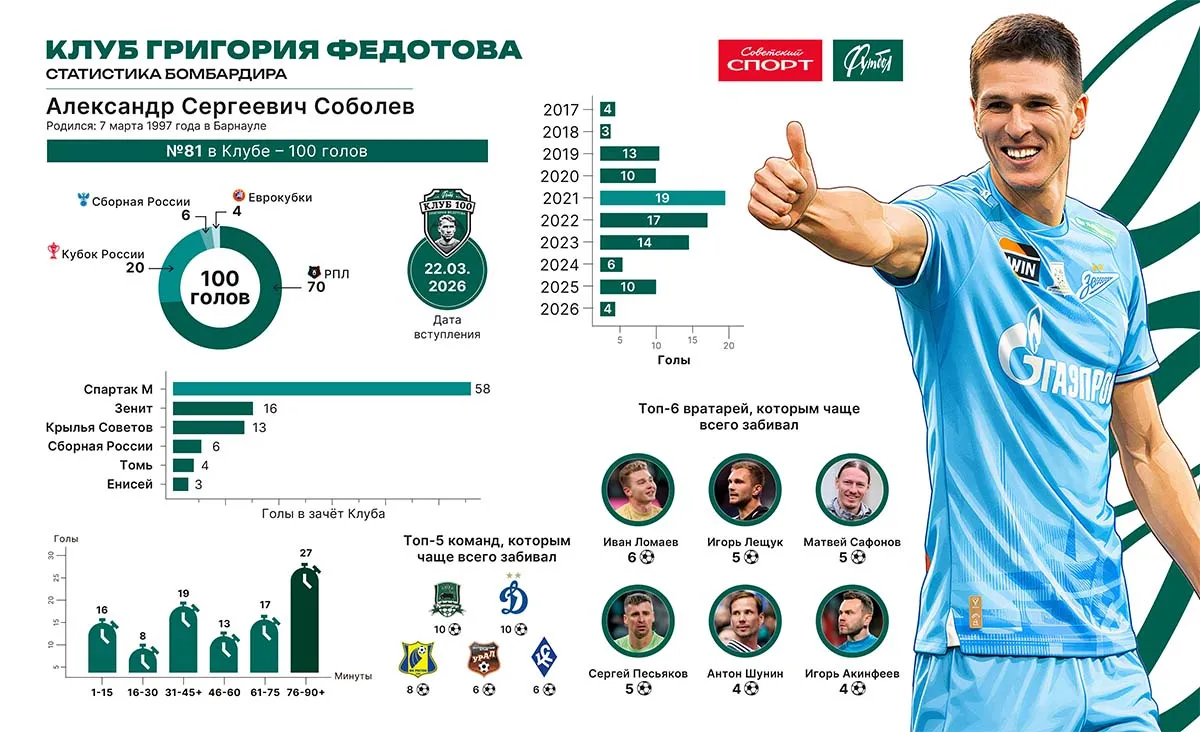Нападающий «Зенита» Александр Соболев вошёл в компанию избранных игроков, сумевших преодолеть отметку в 100 голов в российском футболе. Достижение, оформленное в матче 22-го тура РПЛ с московским «Динамо» (3:1), принесло форварду место в знаменитом Клубе Григория Федотова. Он стал 81-м его участником.