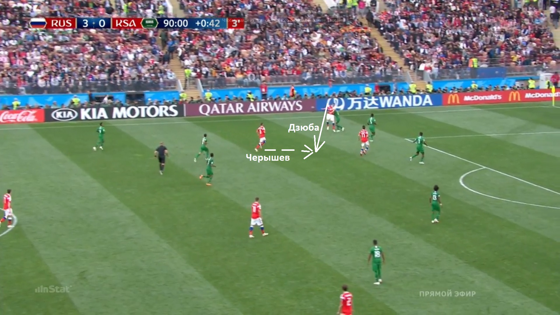 В матче с Саудовской Аравией Денис Черышев забил один из мячей после скидки головой Артем Дзюбы. Форвард разрулил ситуацию после заброса из глубины.