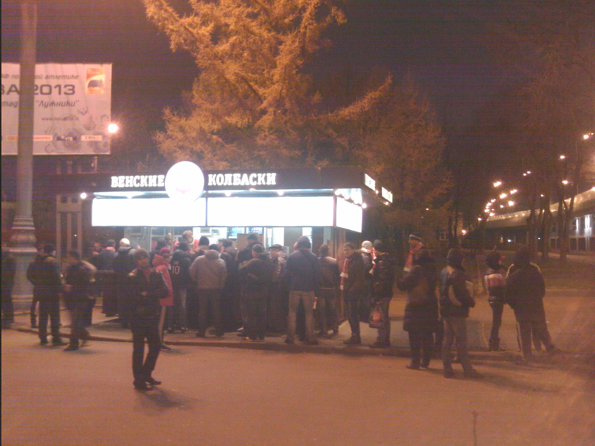 18:10. Очереди за билетами нет, зато есть многолюдная толпа, которая хочет купить венских колбасок или атрибутику на игру.