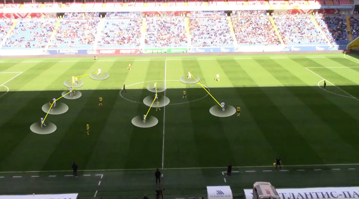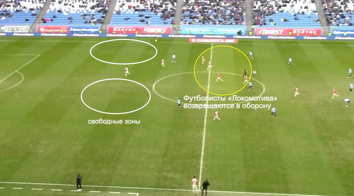 Во втором тайме структуре не хватало гибкости, соперник грамотно атаковал свободные зоны. Один из примеров – на скрине, почти все футболисты «Локомотива» просто не успевают вернуться к обороне.