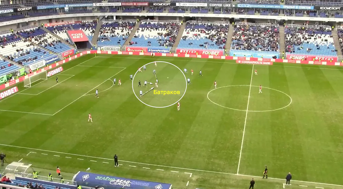 Против «Крыльев» россиянин нанёс один удар в створ и не смог справиться с опекой. Полузащитники «Крыльев» практически не подключались к атаке и постоянно контролировали Батракова.