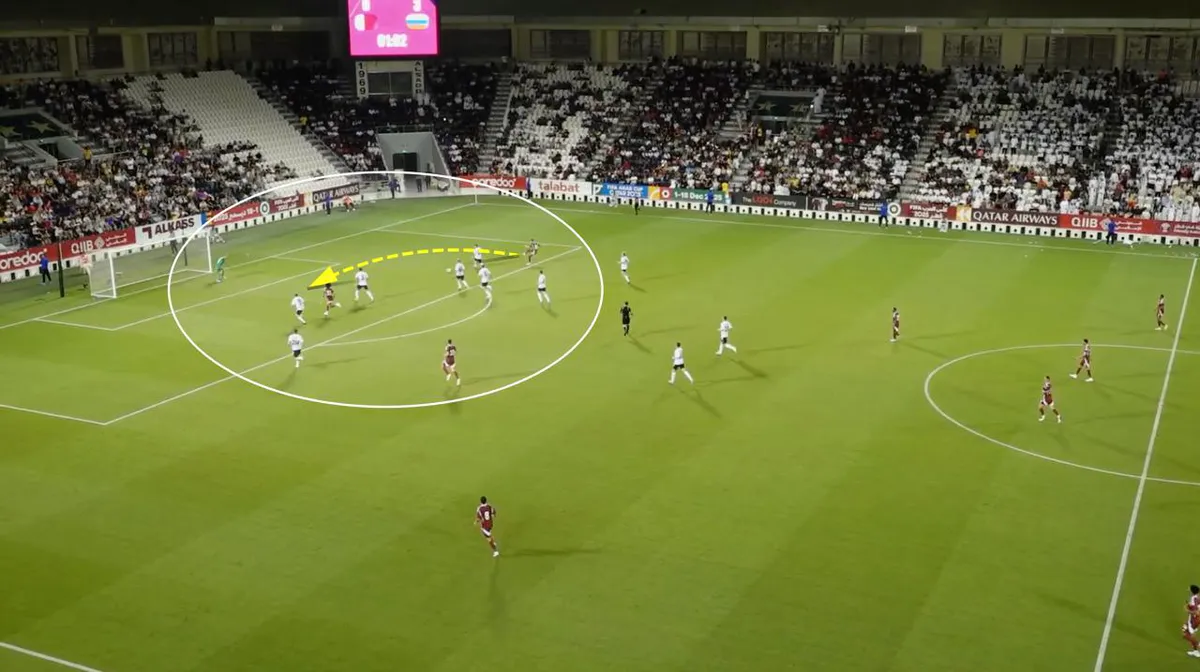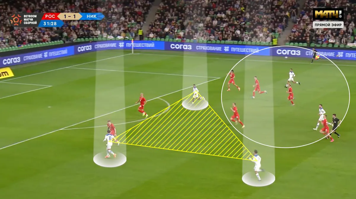 Важная особенность. Сборная России много атакует позиционно, вследствие чего остаётся пространство на своей половине. Многие футболисты не успевают возвращаться в оборону.