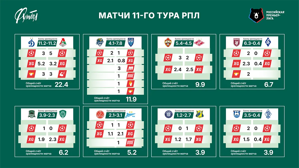 11-й тур получился настолько событийным, что заслуживает отдельного спецвыпуска журнала. Чего стоит только два столичных дерби! «Динамо» и «Локомотив» вообще устроили голевую феерию. Восемь голов на двоих – повторение рекорда для матчей двух московских команд от 1994 года, когда те же железнодорожники разгромили «Торпедо» со счётом 8:0.