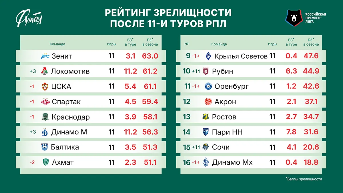 Возвращаясь же к матчу, отметим, что обе команды набрали впечатляющие 11,2 балла зрелищности и поднялись на три строчки в рейтинге зрелищности РПЛ. «Локо» сел на хвост лидирующему «Зениту», а «Динамо» наконец ворвалось в топ-6 и тоже включилось в борьбу за первое место. Отставание от петербуржцев составляет вполне отыгрываемые 6,7 БЗ.