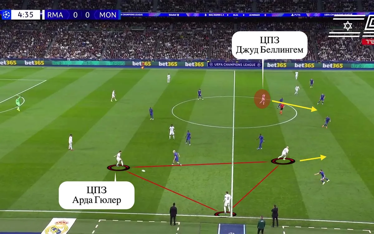 4) регулярная перегрузка правой зоны за счёт смещения туда левоногого Гюлера (при этом другая «восьмёрка» Беллингем совершает много рывков за спину – см. картинку 2 с голевой атакой в игре с «Монако»).