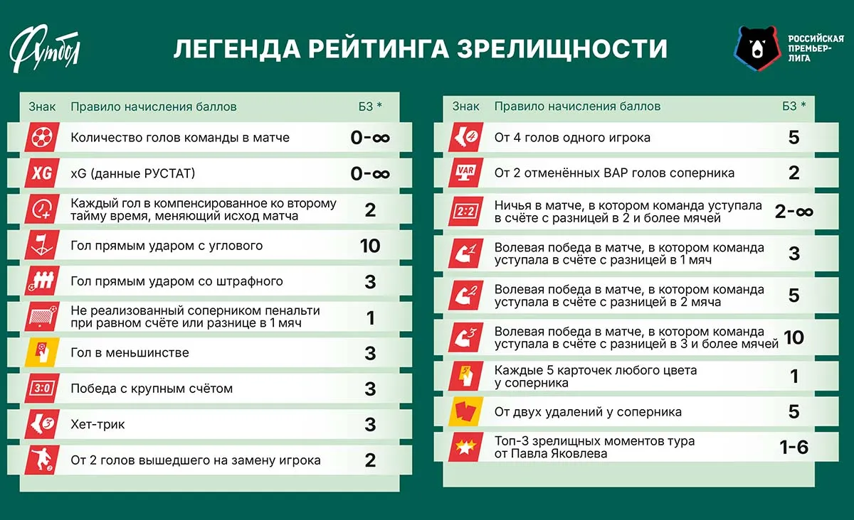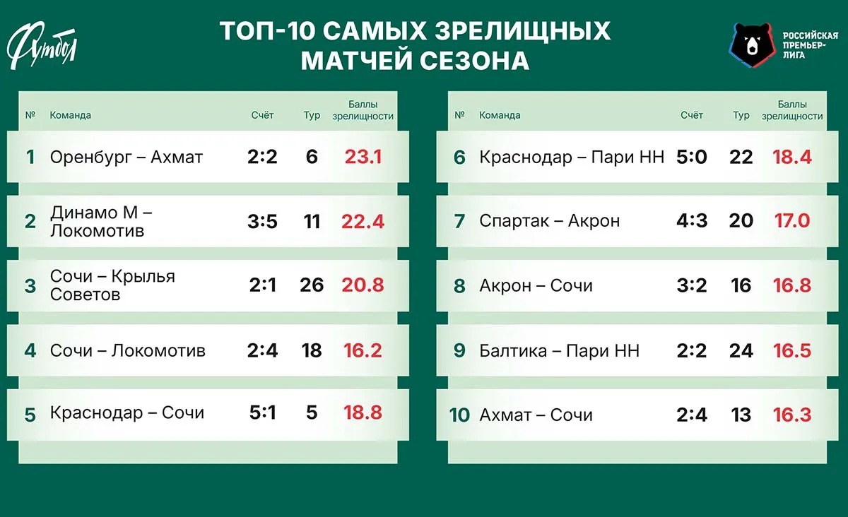 Напомним, в прошлом туре был установлен рекорд нашего Рейтинга (РЗ): «Сочи» за волевую победу над «Крыльями Советов» (2:1) заработал почти 19 баллов зрелищности (БЗ), которые рассчитываются по специальной формуле с учётом 19 критериев. На сей раз столь высоких результатов никто не показал. Однако самым зрелищным в туре опять стал матч, завершившийся волевой победой со счётом 2:1.