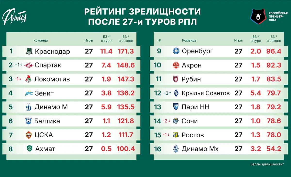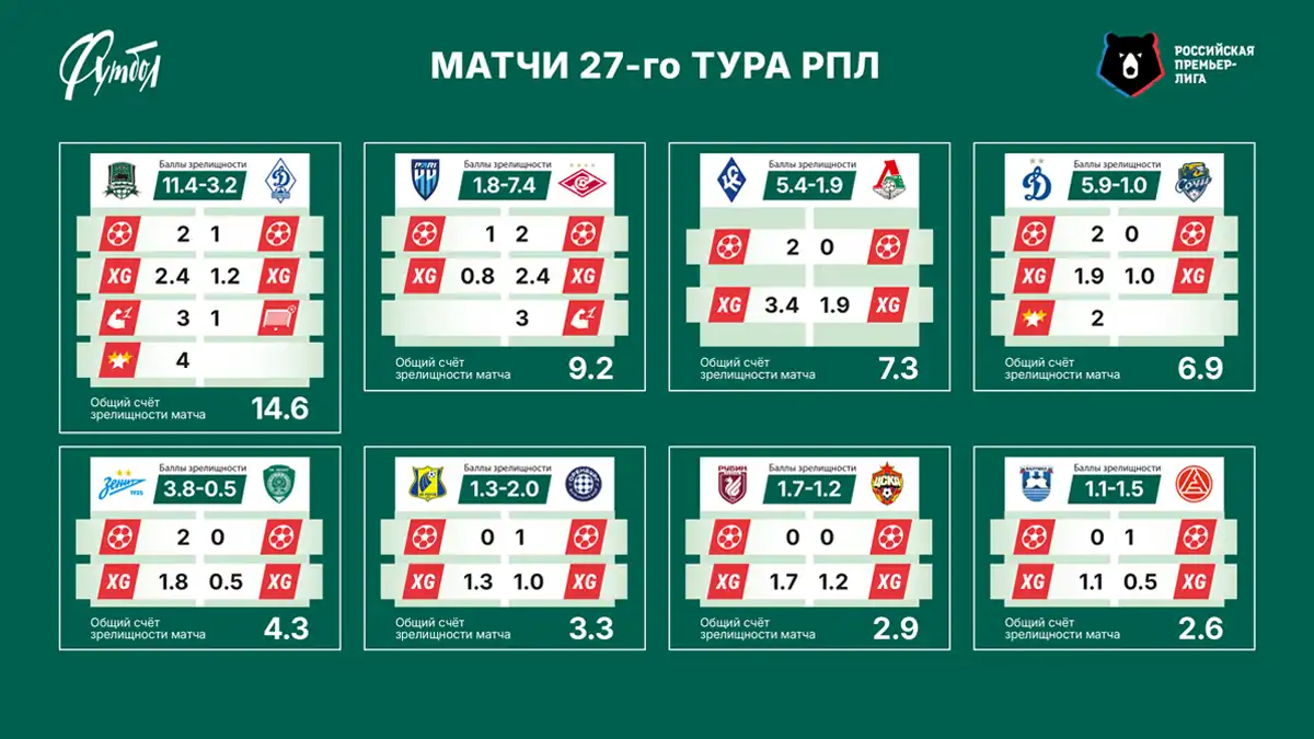 «Краснодар» практически гарантировал победу. Обзор рейтинга зрелищности после 27-го тура