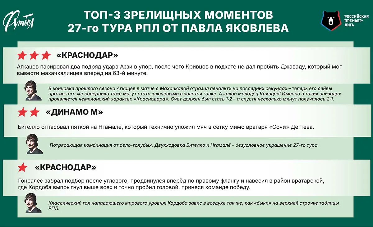 Под номером один (3 БЗ) Яковлев поставил двойное спасение Станислава Агкацева при счёте 1:1, под номером три (1 БЗ) – случившийся вскоре после сейвов вратаря «Краснодара» роскошный гол Джона Кордобы.