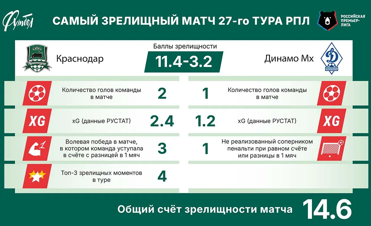 Участники встречи «Краснодара» и махачкалинского «Динамо» общими усилиями заработали 14.6 БЗ, из которых 11.4 пришлись на долю хозяев поля. Помимо трёх бонусных баллов за волевую победу, они получили ещё четыре БЗ от нашего постоянного эксперта Павла Яковлева, который упомянул «быков» дважды (редчайший случай!) в топ-3 ярких моментов тура.