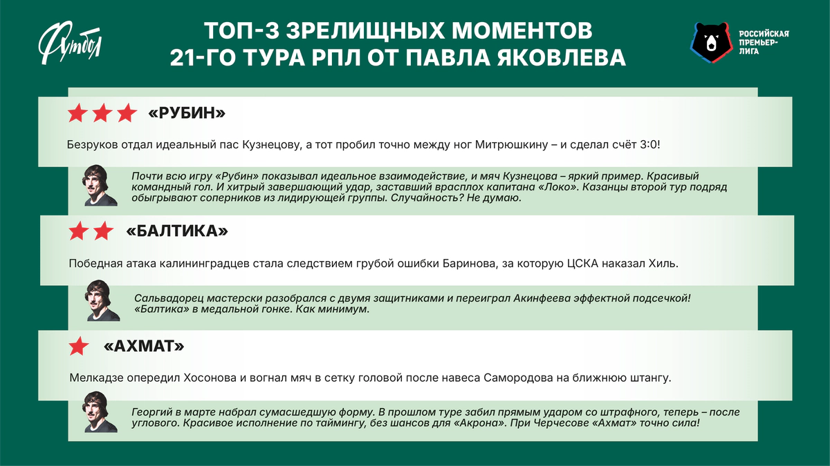 Бывший футболист РПЛ, напомним, каждый раз определяет для нас свою тройку самых зрелищных моментов. Так вот, в 21-м туре его больше всего восхитила изящная комбинация, которая привела к третьему голу «Рубина» за авторством Даниила Кузнецова, пославшего мяч в «домик» Антону Митрюшкину.