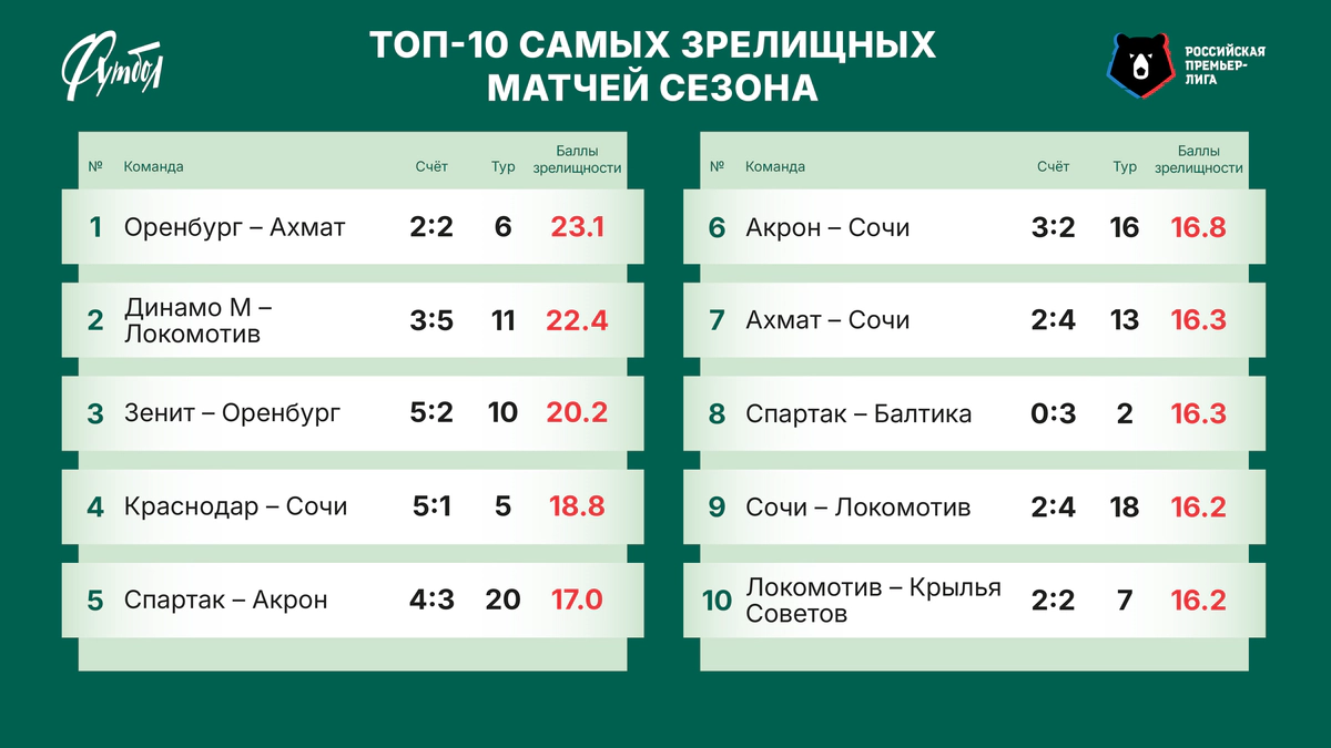 «Краснодар» везде первый. В Рейтинге зрелищности сменился лидер