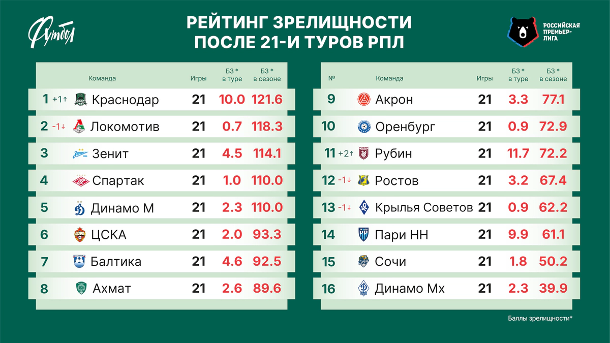 За матч с «Рубином» (0:3) теперь уже бывшие лидеры РЗ получили жалкие 0,7 балла зрелищности (БЗ). Это антирекорд 21-го тура. При том что сама игра на «Ак Барс Арене» была насыщена событиями. По сумме БЗ (12.4) она получилась вообще лучшей в туре! Но почти исключительно усилиями хозяев, которые заработали ещё и максимальный бонус от Павла Яковлева.