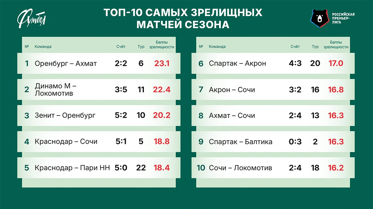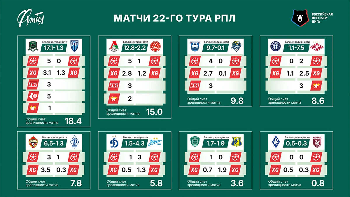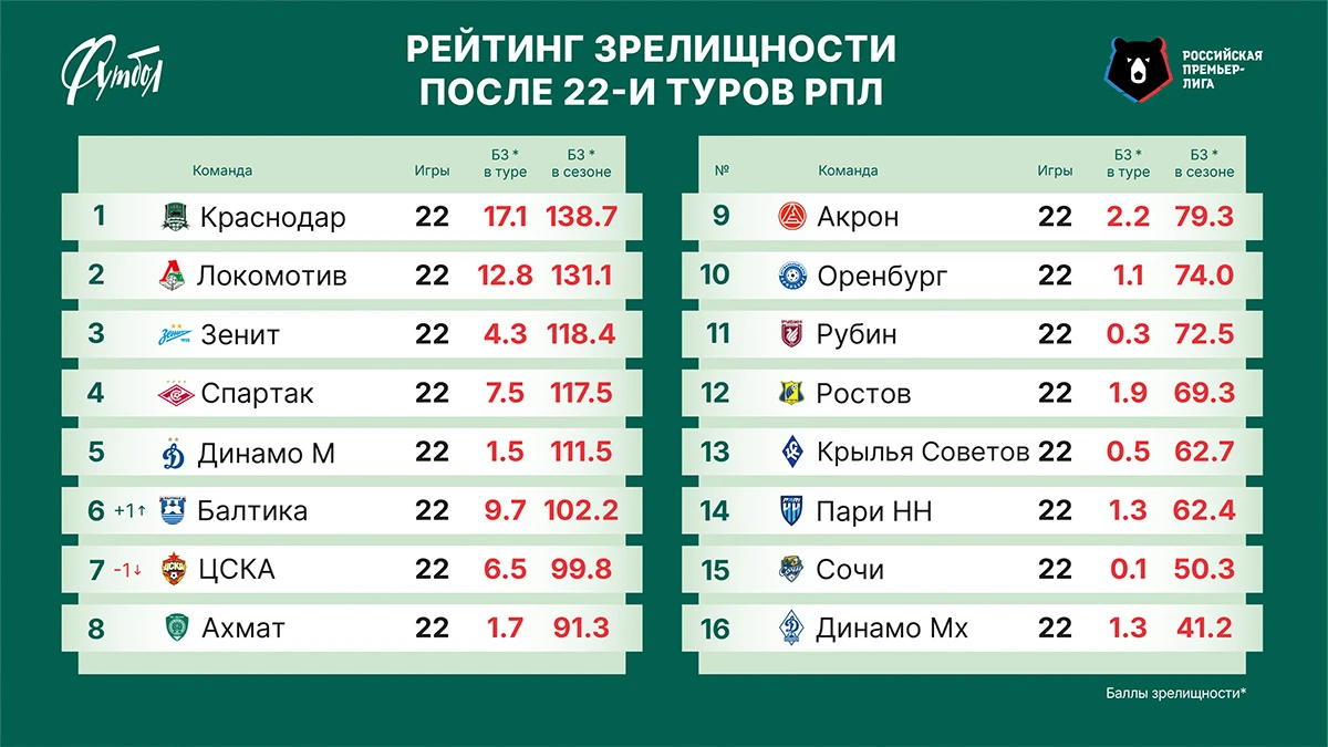Напомним, что «Советский спорт» в течение сезона определяет самую зрелищную команду РПЛ. После матчей 22-го тура «быки» и железнодорожники оторвались от преследователей в нашем рейтинге.