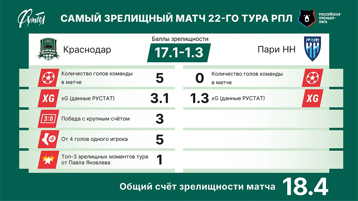 Зато матч «Краснодар» – «Пари НН» (18.4) вошёл в пятёрку самых зрелищных во всём сезоне. Вот только интриги ему явно не хватало. Как и остальным играм уик-энда. Будем верить, после международной паузы ситуация кардинально изменится.