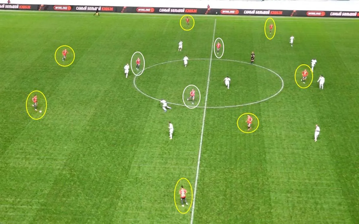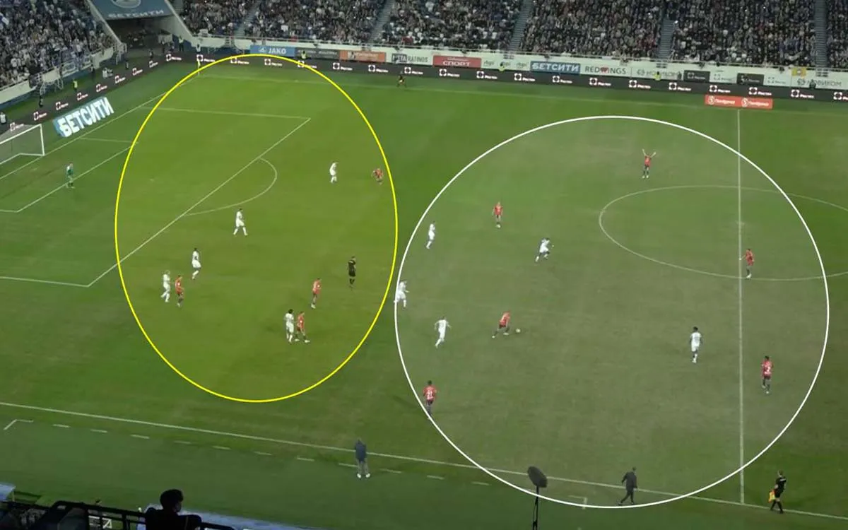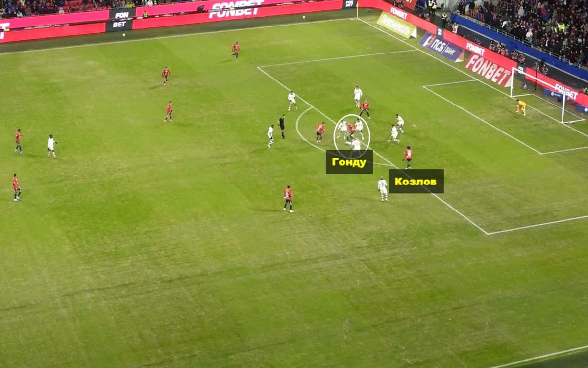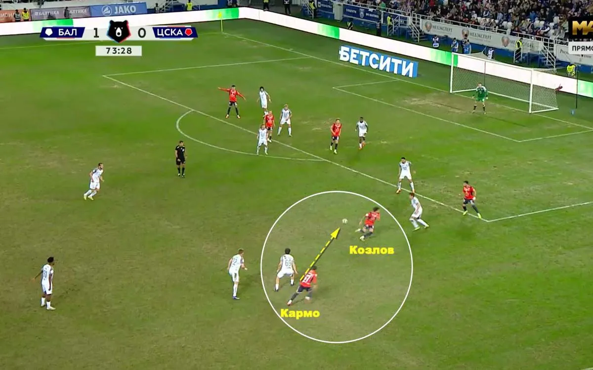 В матчах с ЦСКА соперники защищаются с помощью компактного расположения, прессингуя отдельных футболистов. Заметить уязвимости в расположении не доставляет большого труда. Акцент на атаки с левого фланга легко заметить по свободной позиции Кирилла Глебова. Справа – менее быстрая связка.