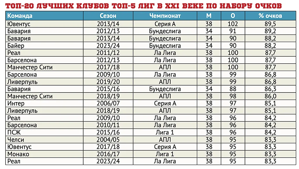 Результат – 102 набранных очка. Просто космический результат, добраться до которого в ближайшем будущем просто некому. Сотку в топ-5 в последнюю четверть века вообще выбивали всего четырежды, а в Серии А это удавалось только «Юве».