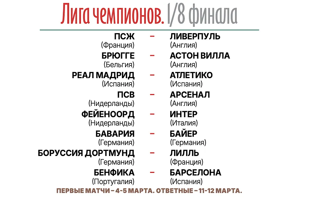 Уже сейчас мы получили такие принципиальные дуэли, как «Реал» – «Атлетико» и «Бавария» – «Байер». Для полного «попадания» не хватило, чтобы «ПСЖ» в соперники досталась «Барселона», однако и «Ливерпуль» – крайне интригующий оппонент. Причём каталонцам как раз повезло, ведь вместо визита в Париж их ждёт «всего лишь» Лиссабон и «Бенфика».
