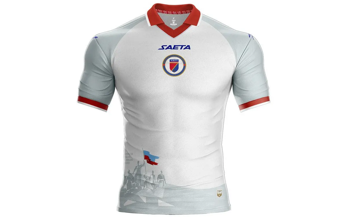 У гостевого комплекта белый и светло-серые цвета. Основной замысел заключается в национальной гордости — пальмы, конусы. А самая необычная деталь — изображение группа гаитянских борцов за свободу, поднимающих флаг независимости.