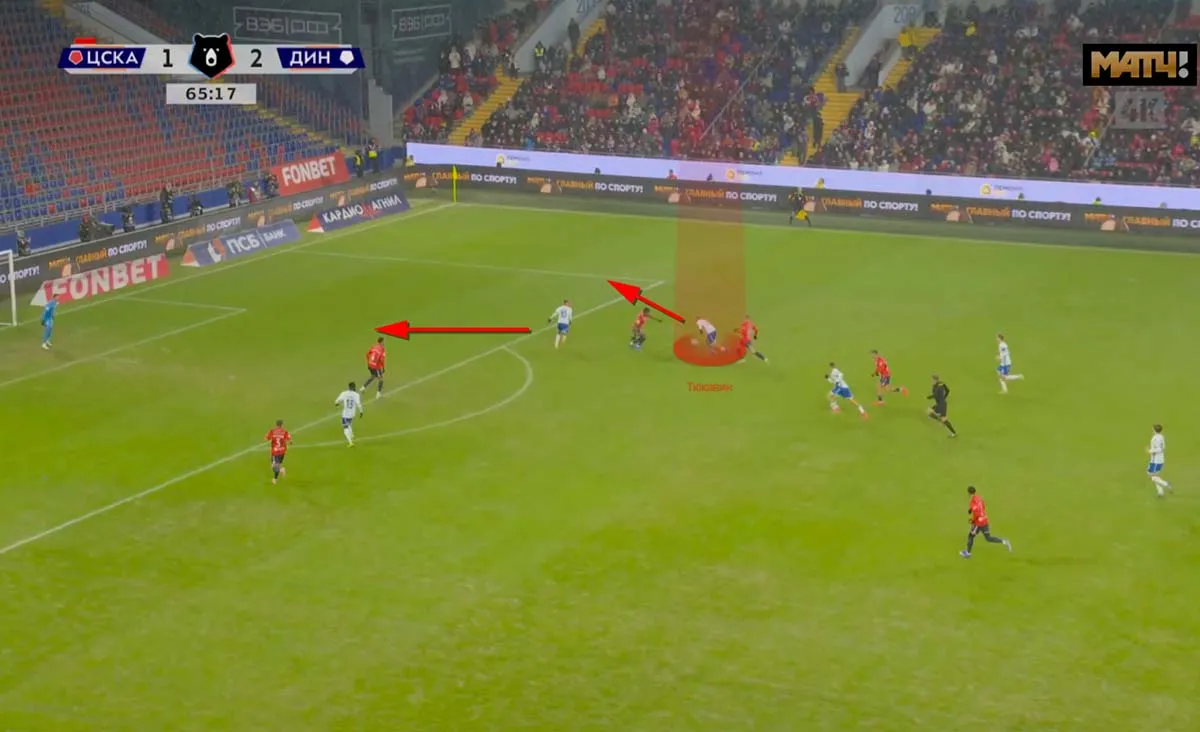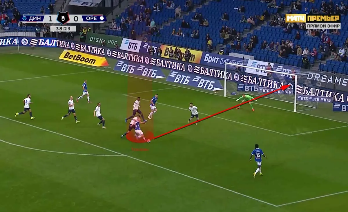 А вот вырезка из третьего мяча динамовцев с ЦСКА (4:1) в 20-м туре. Тюкавин ушёл вправо и запустил вперёд Бителло. Тот без труда разобрался.