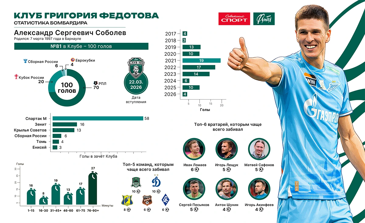 Удар Соболева с нерабочей левой принёс «Зениту» важную победу. А заодно вписал имя 29-летнего нападающего в историю. Кто-то скажет: 100 голов за клубы и сборную — не такое уж большое достижение. Месси и Роналду в годы расцвета забивали столько за полтора-два сезона… Между тем в СССР до клуба Федотова сумели добраться всего 48 человек. В России таких теперь 33.