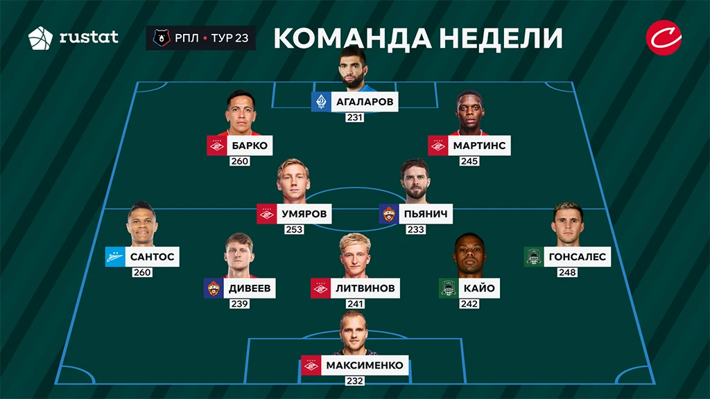 «Советский спорт» и «РУСТАТ» продолжают знакомить поклонников футбола с лучшими игроками чемпионата России по итогам каждого тура. Сейчас на очереди лучшие футболисты по итогам 23-го тура. Наибольшее представительство получил «Спартак», но мы не можем не отметить ярко сверкнувшего Гамида Агаларова из махачкалинского «Динамо».