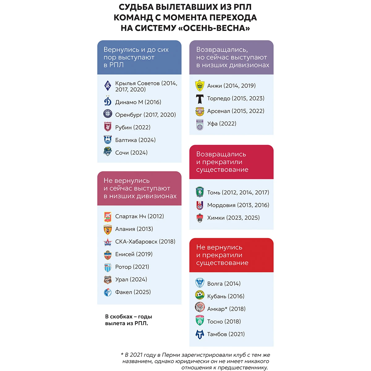 Всего с момента перехода в сезоне-2011/2012 на систему «осень-весна» из 25 клубов, расстававшихся с высшим дивизионом, восемь были (сразу или впоследствии) расформированы. Химчане и пермяки разделили печальную участь с «Мордовией», «Волгой», «Кубанью», «Томью», «Тосно» и «Тамбовом». 8 из 25 – это, на секундочку, 32%! Устрашающие цифры…