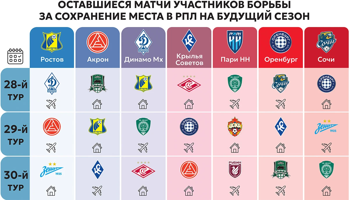 Участников борьбы за выживание могло быть и шесть. Однако «Сочи», который многие заранее похоронили, сенсационной апрельской серией из трёх побед возродил надежды на стыковые матчи. Таким образом, клубы, располагающиеся на местах с 10-го по 16-е, по-прежнему не знают своей судьбы. Дуэт худших в этой компании (помимо сочинцев, в неё входят «Ростов», «Акрон», «Крылья Советов», «Динамо» Мх, «Пари НН», «Оренбург») проследует прямиком в Первую лигу. Ещё двоим после 30-го тура предстоят переходные игры.