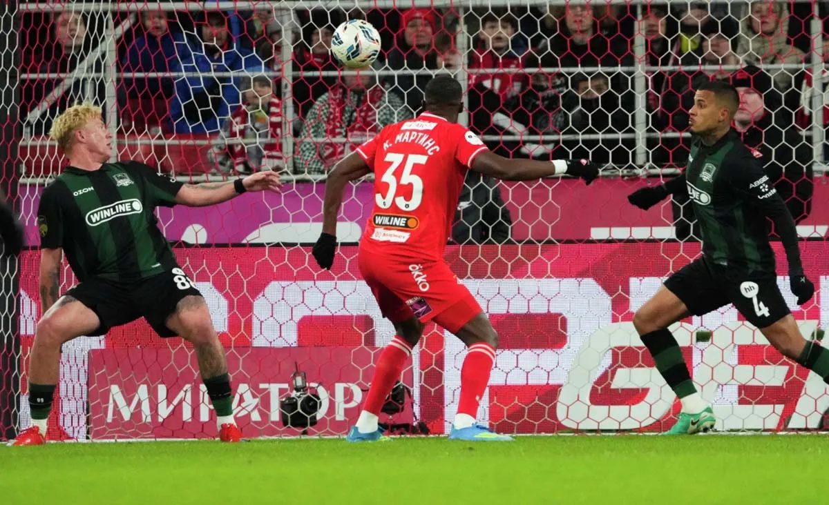 «Красно-белые» не переставали наседать на ворота южан, поэтому гол Мартинса на 38-й минуте стал закономерным сюжетным ходом для первого тайма. А вот то, как этот мяч был забит – что-то из разряда аномалии: при подаче с углового ошибся Агкацев. Мяч отлетел к Наилю Умярову, тот поделился им с Литвиновым, на траектории своеобразного прострела которого и оказался Кристофер.