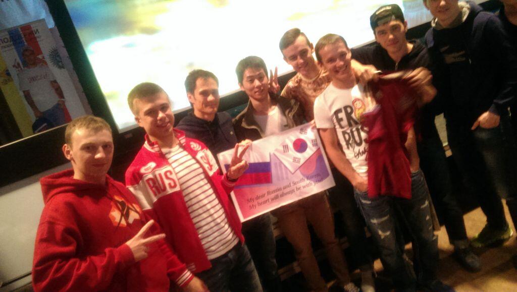 Ан пришел в московский бар с баннером, который придумал вместе с «Советским спортом»: «Россия и Корея – навсегда в моем сердце».