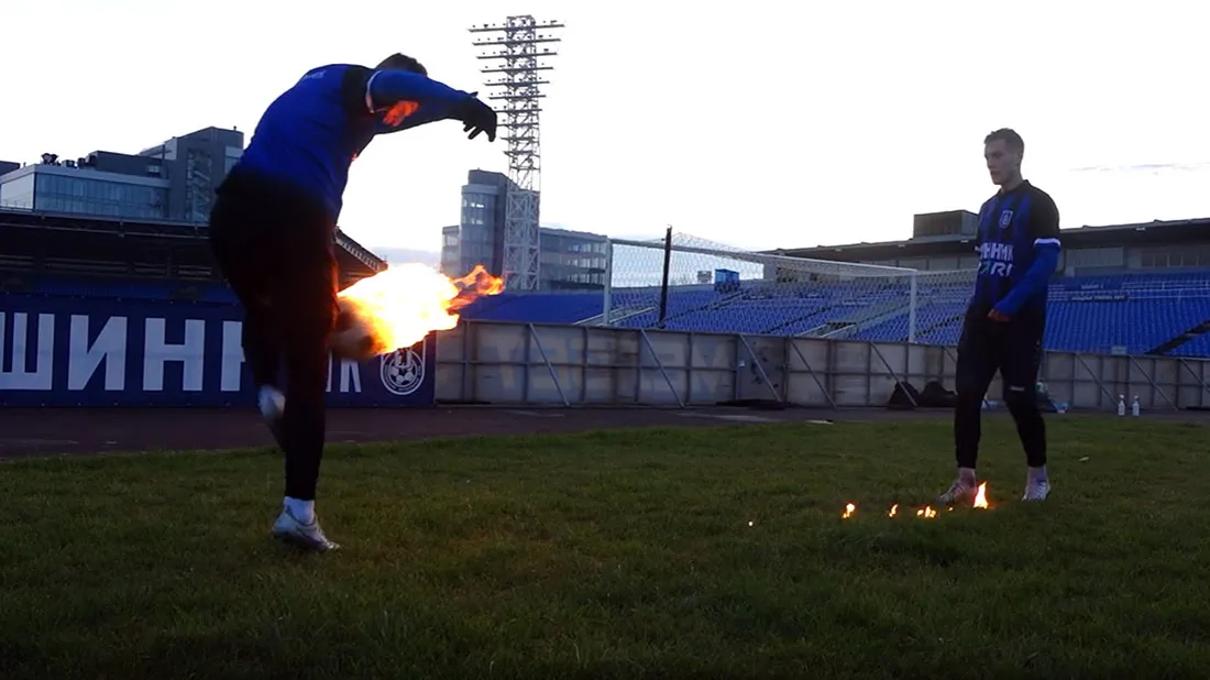 На стадионе «Шинник» футболисты ярославского клуба Дмитрий Шадринцев и Дмитрий Малыхин устроили захватывающее шоу с использованием огненного мяча, представив тем самым уникальный трюк.