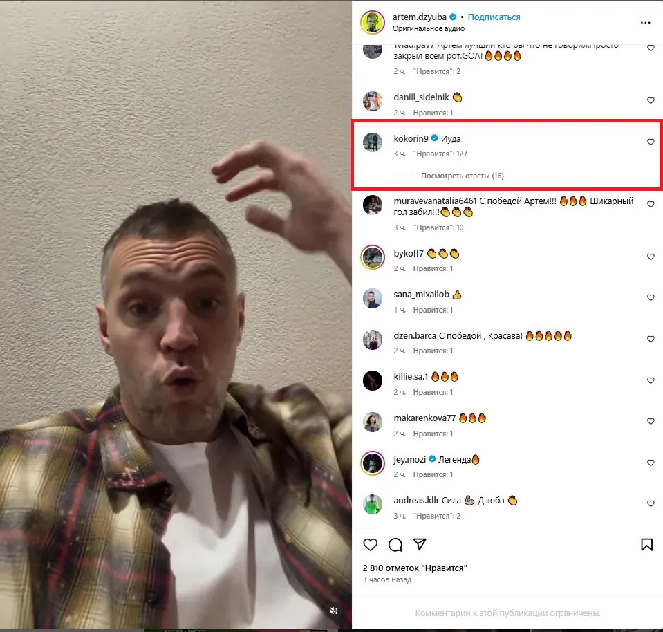 Нападающий кипрского «Ариса» Александр Кокорин оставил неоднозначный комментарий в социальных сетях Артёма Дзюбы после того, как нападающий «Акрона» забил в ворота «Зенита» в матче Российской Премьер-лиги (РПЛ).