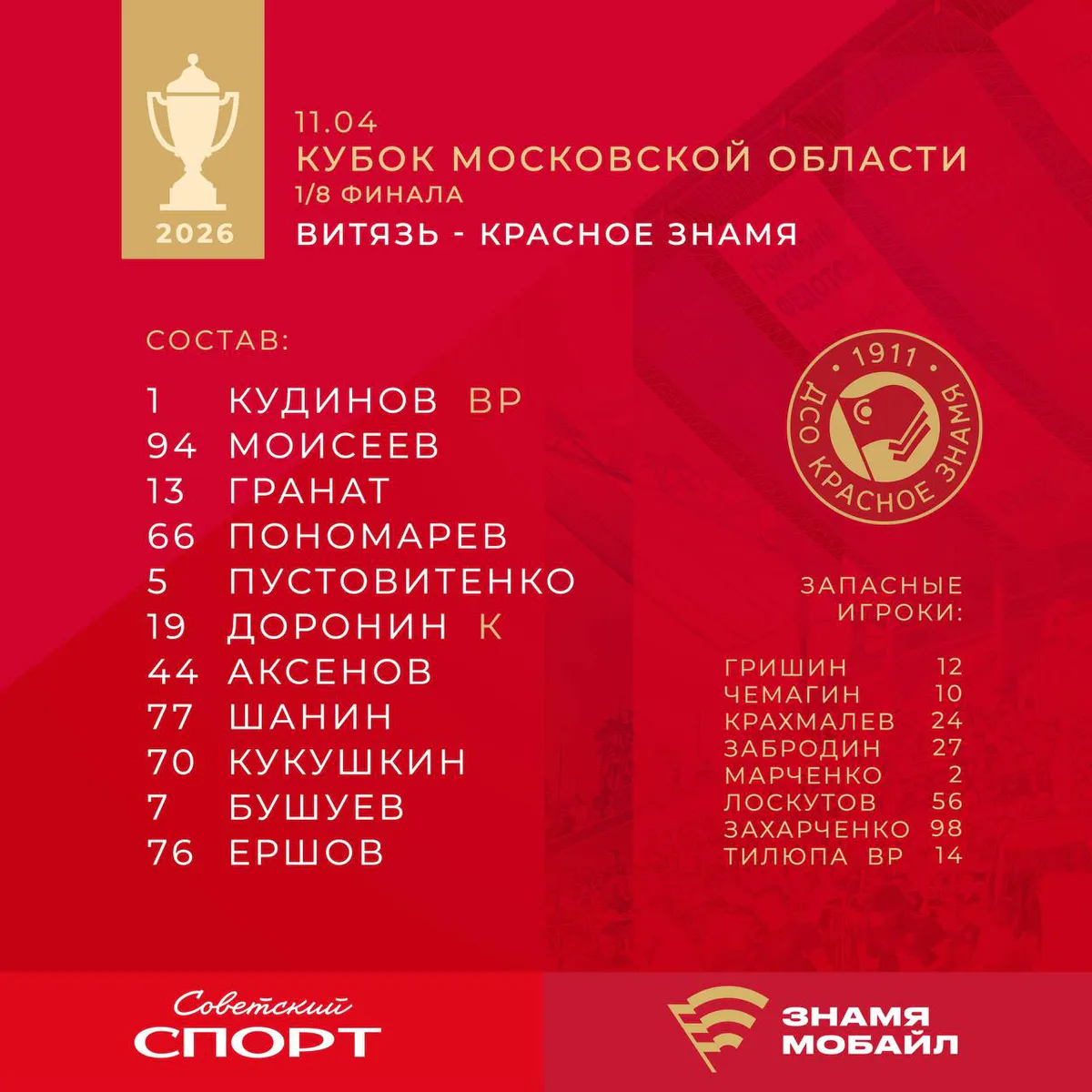 Первое знакомство болельщиков «Красного Знамени» с обновлённой в межсезонье командой состоялось 11 апреля. В этот день подопечные Артёма Сомова провели на ногинском стадионе «Старт» матч 1/8 финала Кубка Московской области против СК «Витязь».