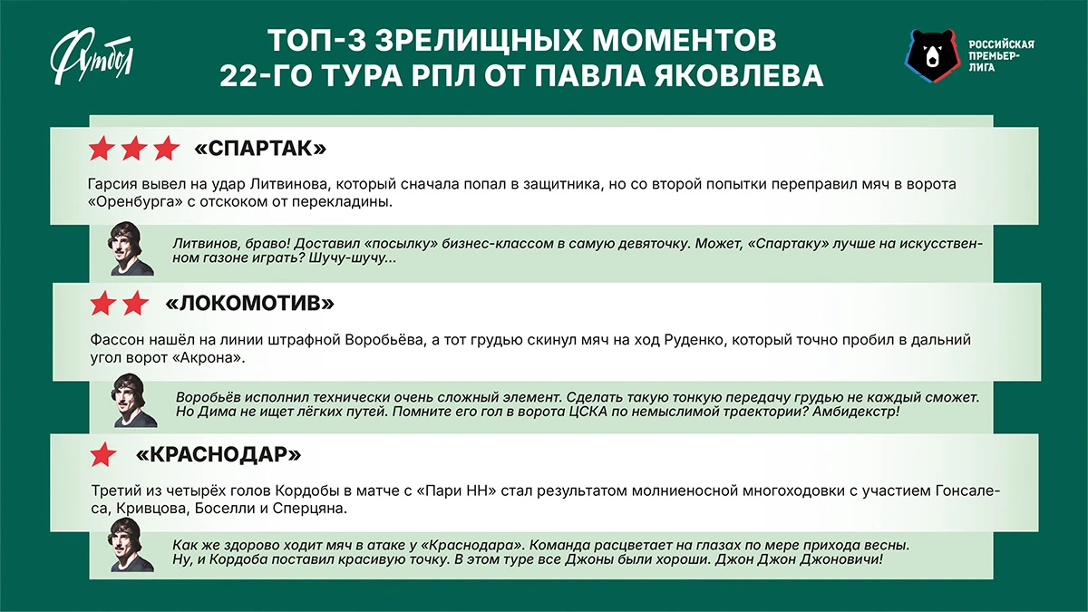 Эксперт «Совспорта» и бывший футболист «Спартака» Павел Яковлев составил топ-3 самых зрелищных момента 22-го тура Российской Премьер-Лиги.
