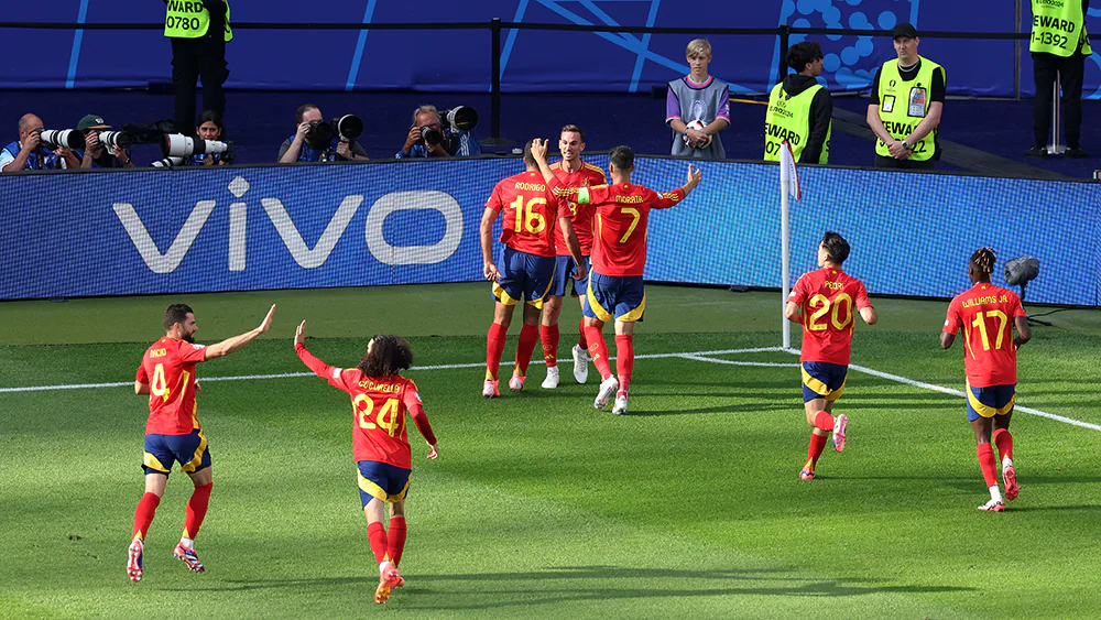 Сборная Испании ведёт со счётом 3:0 после первого тайма матча Евро-2024 против команды Хорватии. На 29-й минуте отличился Альваро Мората. Уже через три минуты Фабиан Руис удвоил преимущество испанцев. На второй добавленной минуте забил Даниэль Карвахаль с передачи 16-летнего Ламина Ямаля.