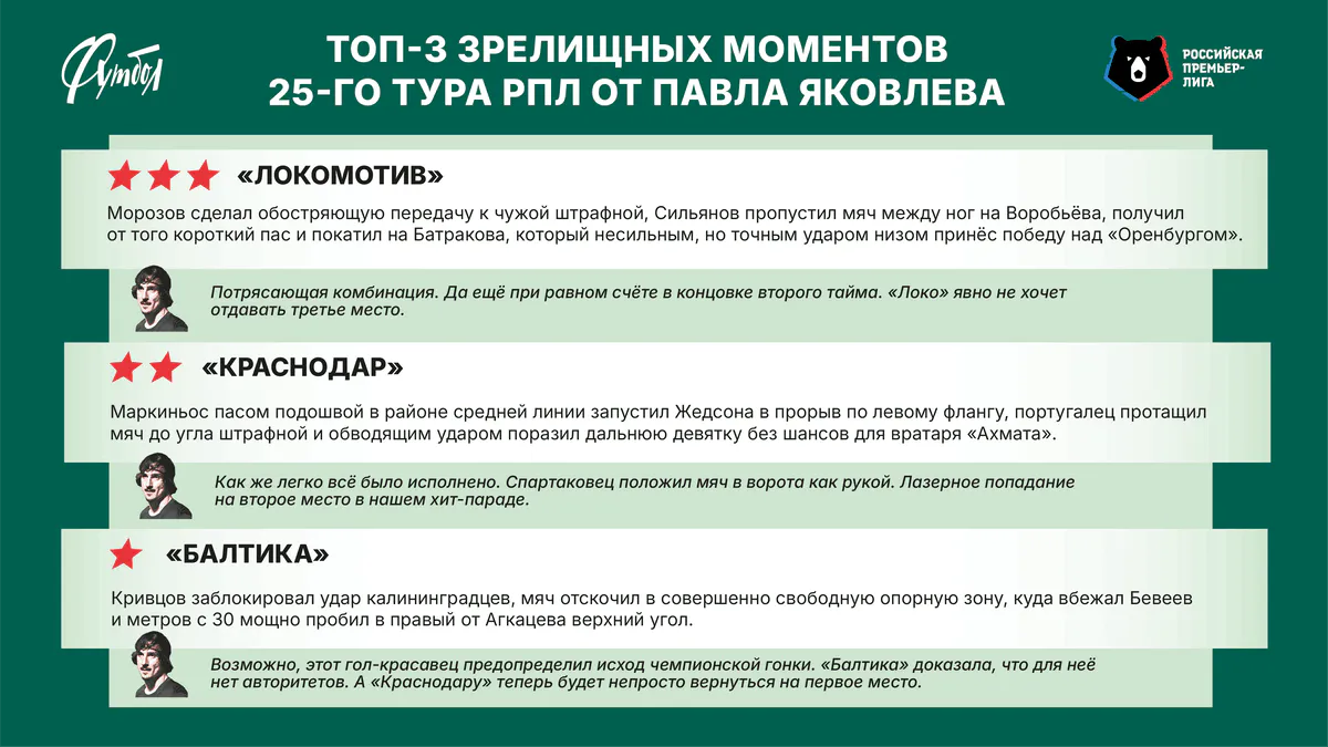На первое место он поставил единственный гол «Локомотива» в матче с «Оренбургом» (1:0). Морозов сделал обостряющую передачу к чужой штрафной, Сильянов пропустил мяч между ног на Воробьёва, получил от того короткий пас и покатил на Батракова.