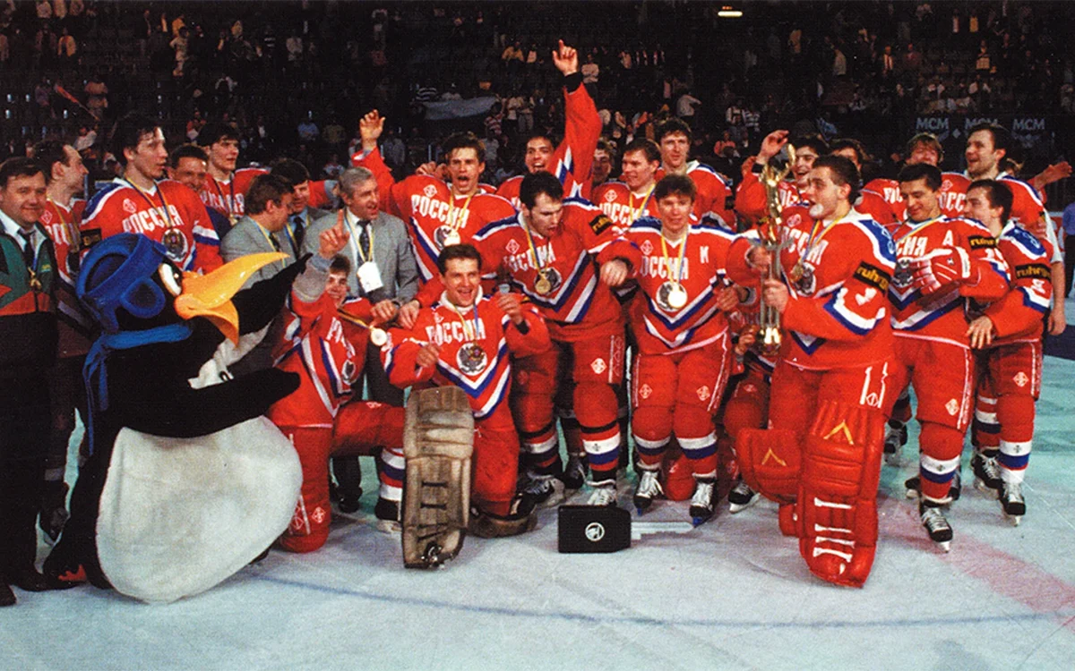 В 1993-м ситуация была почти схожей — правда, на чемпионат мира Быков вообще мог не поехать из-за травмы. Лидер сборной все-таки добрался до Мюнхена и занимался в специальной повязке. Бэкграунд у той команды был даже «веселее» олимпийского. Параллельно существовали «олимпийская» сборная Тихонова и «национальная» Бориса Михайлова, которая и представляла страну на чемпионате мира. В Федерации шла свара за деньги, разные группы влияния тянулись к власти, сборная Россия начала турнир с ничьи против Италии (2:2), потом проиграла Швеции (2:5) и Канаде (1:3).